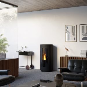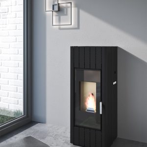 Pelletofen mit raff iniertem Design, strenger Geometrie und großer ästhetischer Wirkung.
